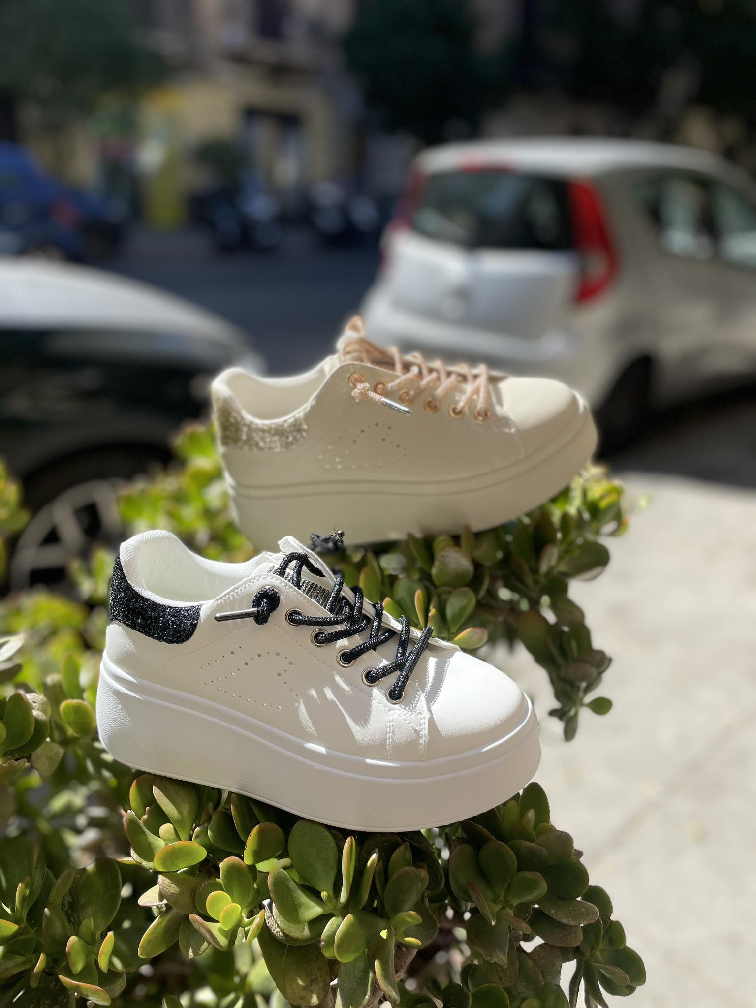 Sneakers Donna in Pelle Beige o Bianco-Nero con lacci in Glitter